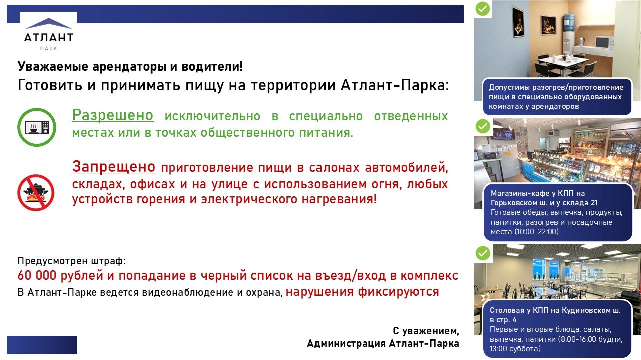 На территории Атлант-Парка действуют Правила пользования объектами недвижимости. За их несоблюдение применяются меры ответственности, в т.ч. финансовые